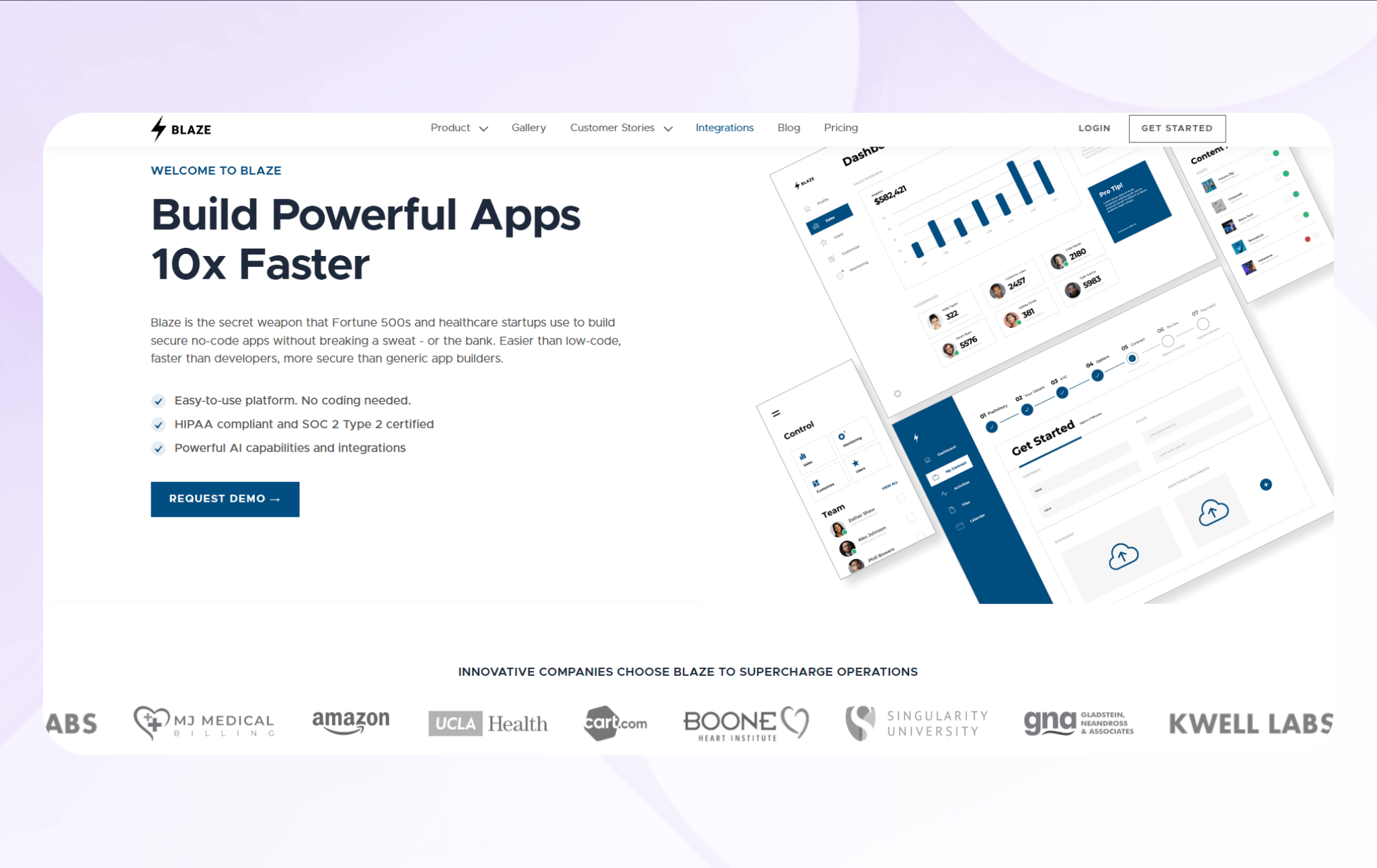 Blaze is a no-code web app builder that lets teams create secure business apps without hiring a development company. It has features that help you maintain HIPAA and SOC 2 compliance, making it a strong choice for regulated sectors such as healthcare and finance.
